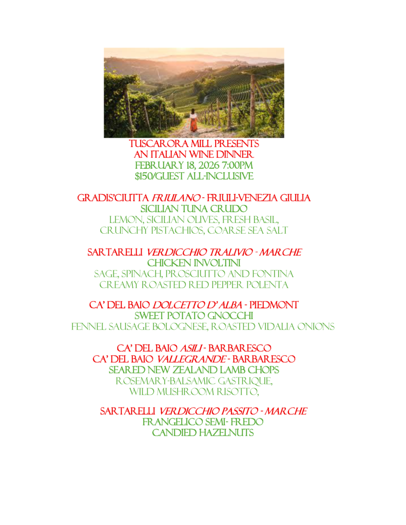 Join Tuscarora Mill for an elegant Italian Wine Dinner on February 18, 2026 at 7:00 PM, a thoughtfully curated, multi-course evening celebrating Italy’s diverse regions and classic pairings. The journey begins in Friuli with Gradis’ciutta Friulano alongside pristine Sicilian tuna crudo, moves through Marche with Sartarelli Verdicchio Tralivio paired to chicken involtini and roasted red pepper polenta, and continues to Piedmont with Ca’ Del Baio Dolcetto d’Alba and sweet potato gnocchi in fennel sausage bolognese.